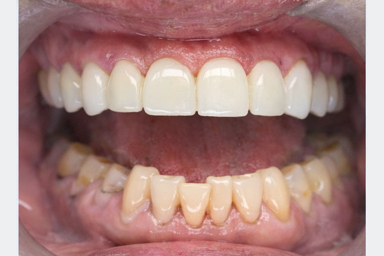 This patient received an upper dental implant bridge to replace missing teeth and restore the smile. The bridge blends naturally with the surrounding teeth, improving both appearance and function while helping the patient smile and eat with confidence.